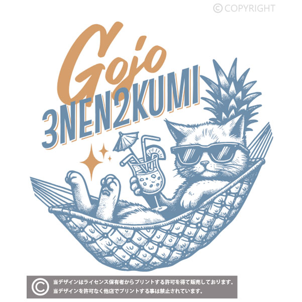 猫がバカンスを楽しむデザインが目立つクラスTシャツ向けのデザイン。GOJO CLASSの部分を〇〇HRにしたり、色も自由に変更が可能です。