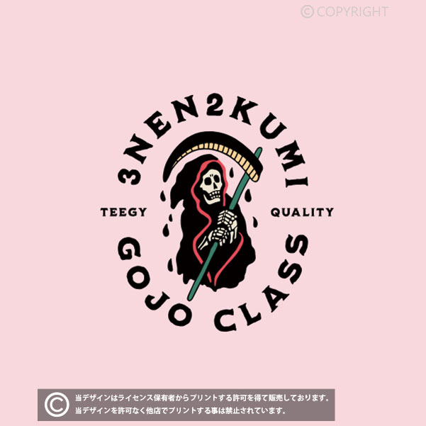 ポップな死神のデザインが目立つクラスTシャツ向けのデザイン。3NEN2KUMIの部分を担任の名前にしたり、色も自由に変更が可能です。